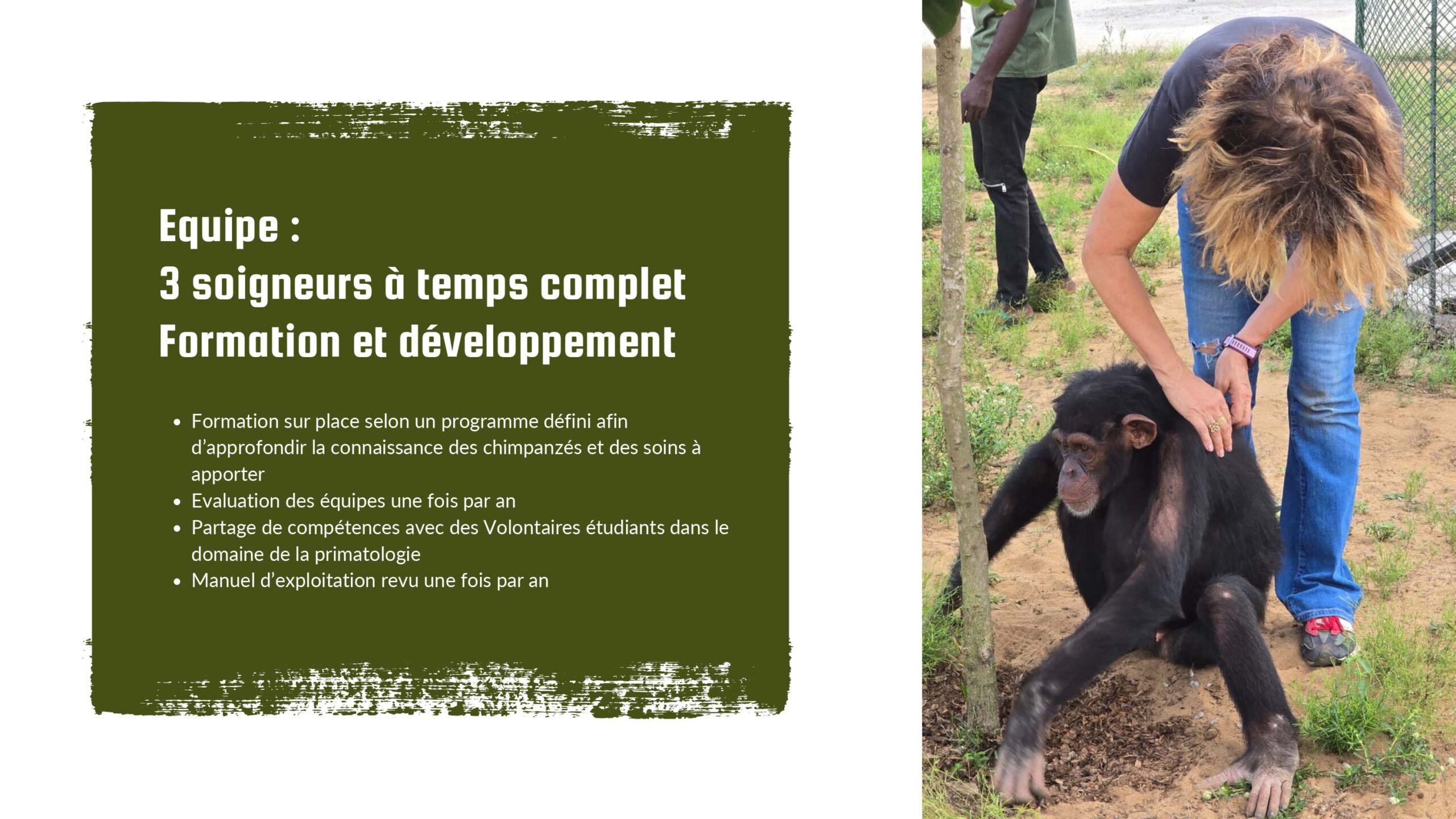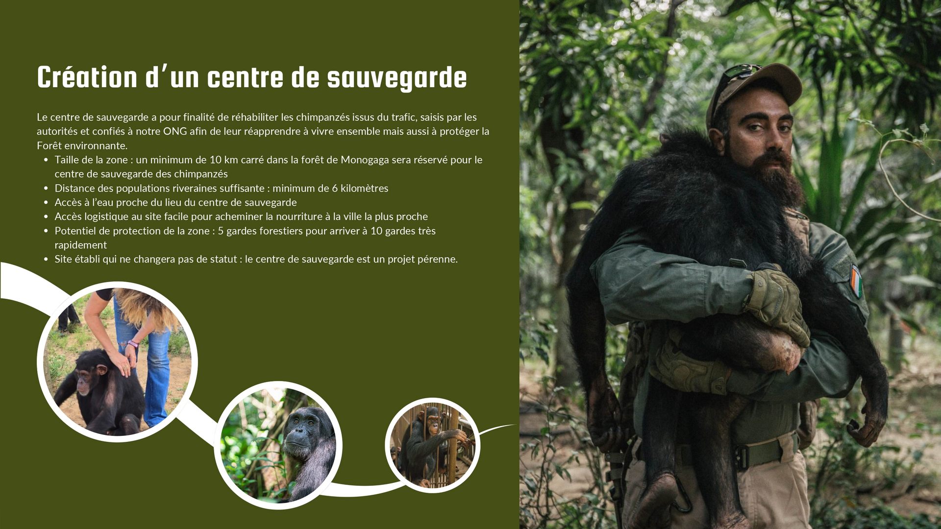 Le centre de sauvegarde a pour finalité de réhabiliter les chimpanzés issus du trafic, saisis par les autorités et confiés à notre ONG afin de leur réapprendre à vivre ensemble mais aussi à protéger la Forêt environnante…